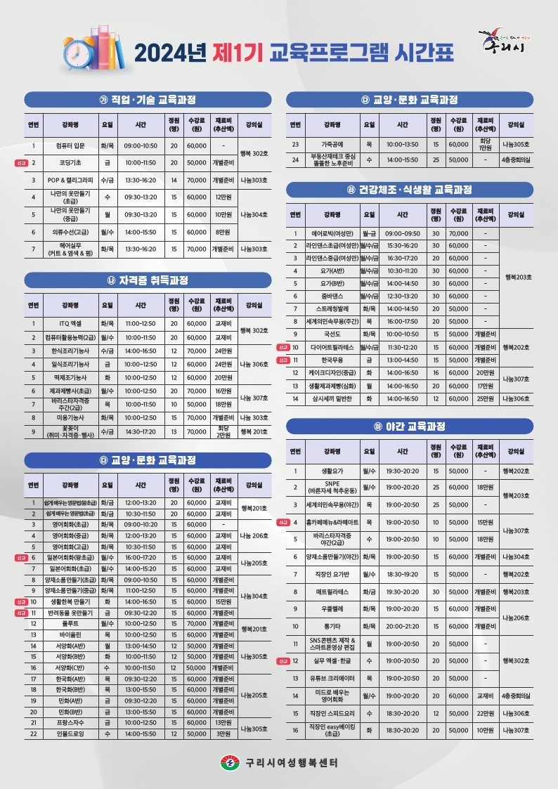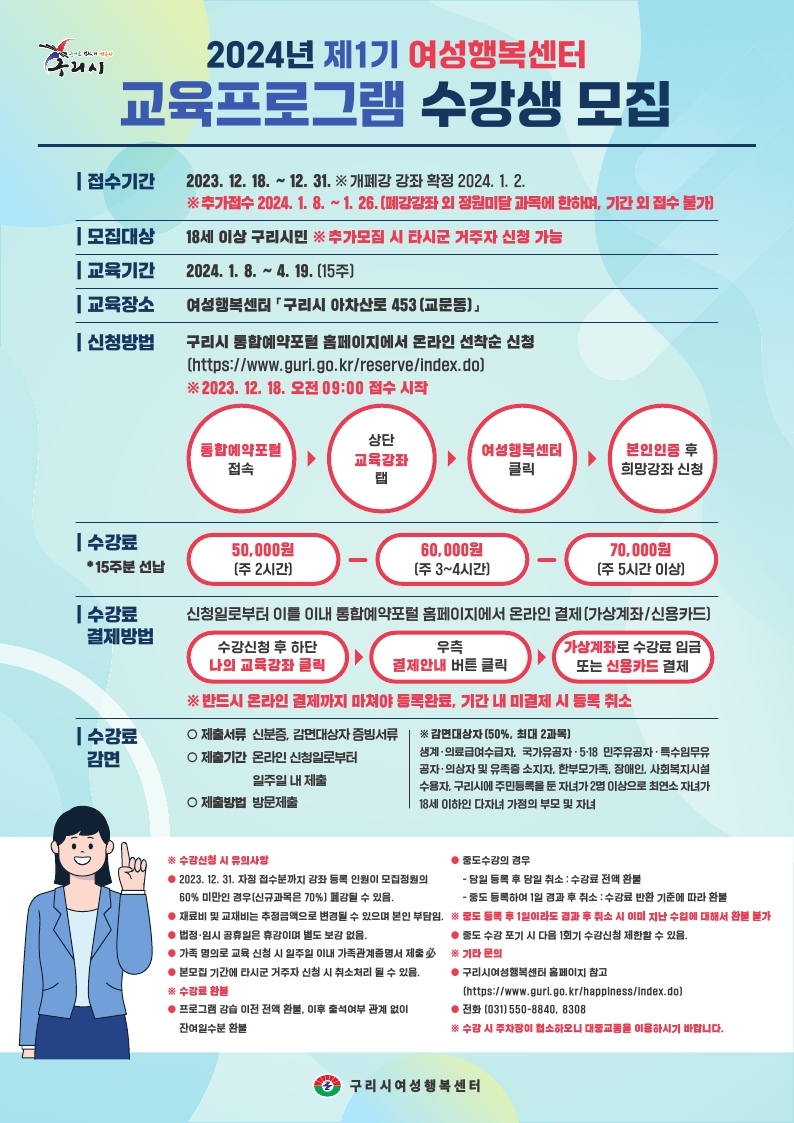 ▣ 2024년도 제1기 여성행복센터 교육프로그램 수강생 모집 □ 교육기간 : 2024. 1. 8. ~ 4. 19. (15주) □ 접수기간 : 2023. 12. 18. (09:00) ~ 12. 31. (23:59) ○ 개폐강 강좌확정 : 2024. 1. 2. ○ 추가접수 : 2024. 1. 8. ~ 1. 26. (※ 방문접수, 기간 외 접수 불가) □ 교육대상 : 18세 이상 구리시민(※ 추가접수 기간 타시군 거주자 신청 가능) □ 모집과목 : 5개 분야 70강좌(신규강좌 8강좌 포함) ※ 신규개설 강좌 : 코딩기초, 일본어회화(왕초급), 생활한복 만들기, 반려동물 옷만들기, 다이어트 필라테스, 한국무용 □ 신청방법 : 구리시 통합예약포털(https://www.guri.go.kr/reserve/index.do) 온라인 접수 ※ 자세한 수강신청 방법은 첨부파일을 확인하여 주시기 바랍니다. □ 수 강 료 : 50,000원(주 2시간 미만), 60,000원(주 3~4시간), 70,000원(주 5시간 이상) ○ 수강료 납부 : 신청일로부터 이틀 내 온라인 결제(가상계좌/신용카드) ※ 기한 내 미결제 시 무통보 취소 ○ 수강료 감면(50%, 최대 2과목) - 증빙서류 必 - 생계·의료급여수급자 - 국가유공자 또는 유족증 소지자 - 5·18 민주 유공자 또는 유족증 소지자, 특수임무유공자 또는 유족증 소지자 - 의상자 또는 유족증 소지자, 한부모가족, 장애인, 사회복지시설 수용자 - 구리시에 주민등록을 둔 자녀가 2명 이상으로 최연소 자녀가 18세 이하인 다자녀 가정의 부모 및 자녀 ※ 개설강좌는 교육과정 게시판 참고 바라며, 12/31 자정 접수분까지 교육과목의 등록 인원이 모집정원의 60% 미만인 경우(신규과목은 70%) 강좌는 폐강될 수 있음을 알려드립니다. 문의전화: 031-550-8840, 8308 |