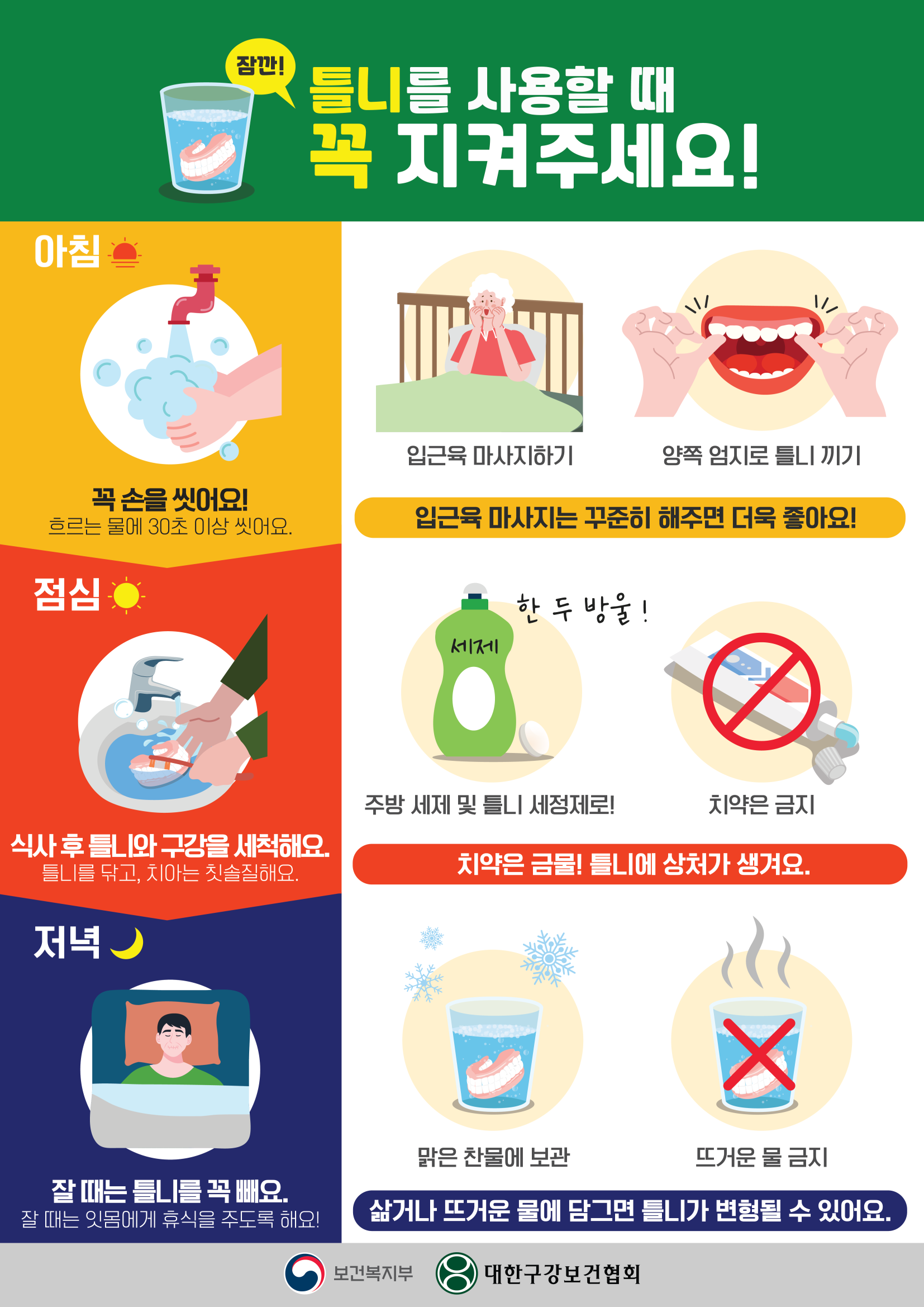 알고 계셨나요? 쉽지만 틀리기 쉬운 틀니 관리방법을 구강보건센터에서 알려드립니다. 주변에 틀니를 사용하는 분들이 있다면 틀린 방법으로 관리하고 있지는 않은지 확인하시고, 올바른 관리방법을 알려주세요! ![]() |