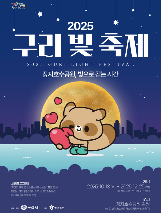 겨울 밤, 장자호수공원이 눈부신 빛으로 깨어납니다.구리의 오래된 설화와 따스한 겨울동화가 만나, 공원 곳곳을 환상의 이야기로 물들입니다. 가족과 연인, 친구가 함께 걷는 길 위에서 찬란한 조명 속 추억이 피어나고, 빛으로 만든 포토존과 체험공간이 누구에게나 소중한 겨울 하루를 선물합니다. 구리의 이야기가 빛으로 흐르는 밤, 도시의 밤하늘에 감성을 더하는 축제가 시작됩니다. 빛과 음악, 웃음이 어우러진 2025 구리 빛축제에서 당신의 겨울을 특별하게 밝혀보세요.