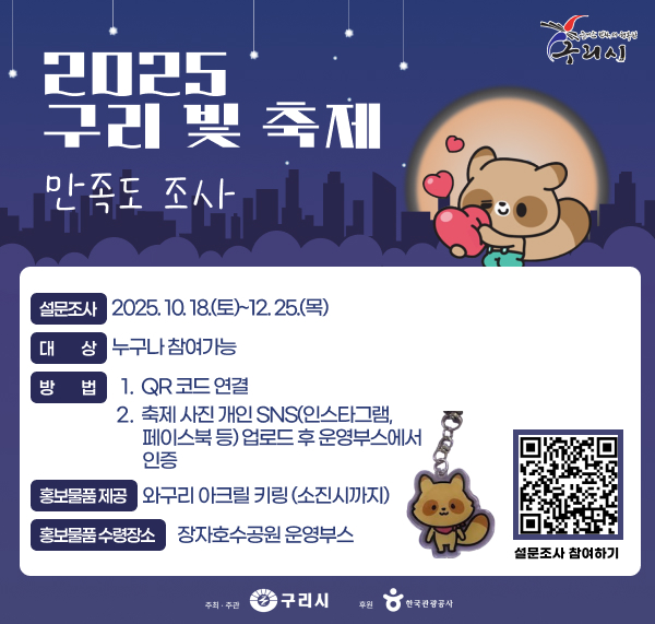 설문조사 / SNS 이벤트 홈 설문조사/SNS 이벤트 설문조사 / SNS 이벤트 공유하기 네이버 페이스북 링크 프린트하기 설문조사 / SNS 이벤트 현재선택된메뉴텍스트 설문조사 / SNS 이벤트 빛 축제 기간 동안 만족도 조사 또는 SNS 이벤트에 참여하시면 선착순으로 구리시 대표 캐릭터인 ‘와구리 아크릴 키링’을 증정합니다. 이미지 확대보기 설문조사 사이트 바로가기