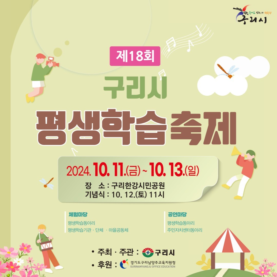 ★ 제18회 구리시 평생학습축제 개최 안내★ ○ 기 간 : 2024.10.11.(금) ~ 10.13.(일) 10:00~18:00 (3일간) ○ 장 소 : 구리한강시민공원 (잔디광장 및 인라인스케이트장) ○ 문 의 : 구리시 평생학습과(☎ 031-550-8773) |