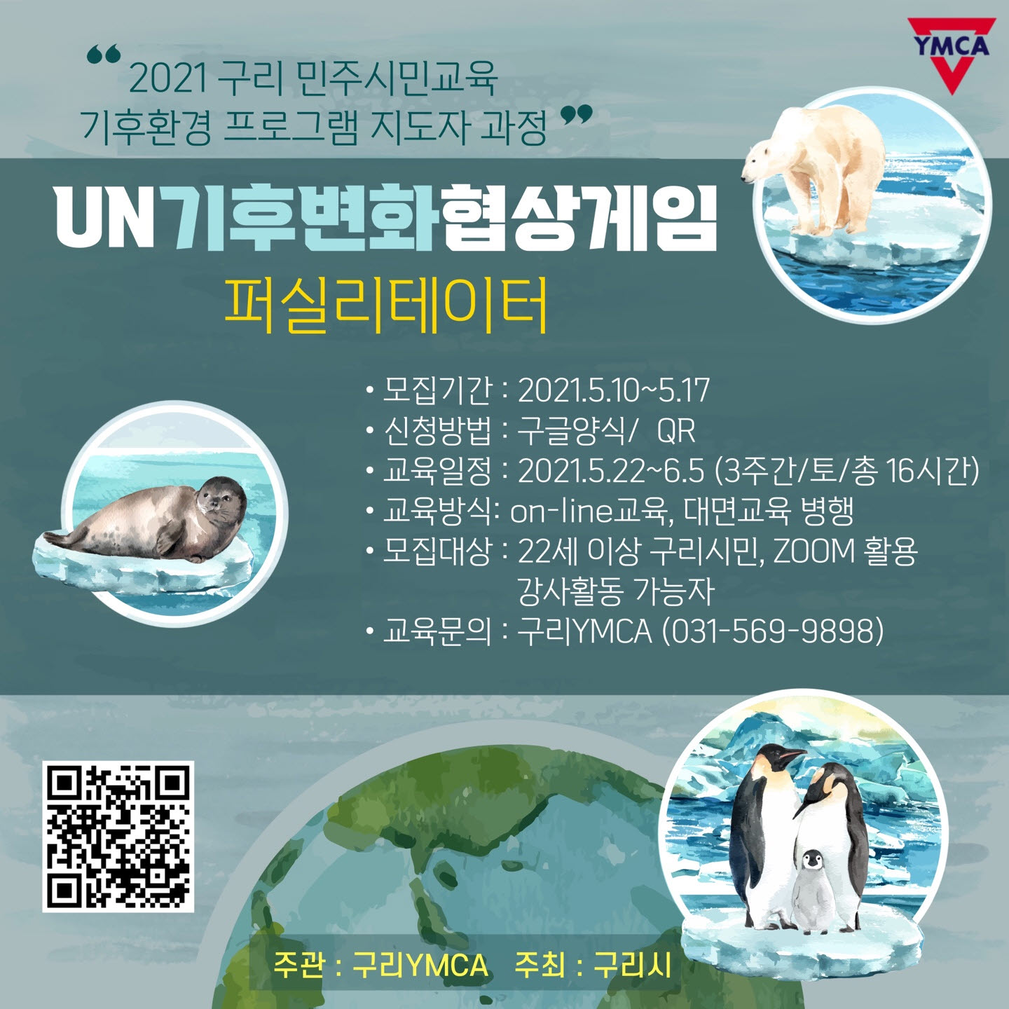 2021 민주시민교육 [기후환경 프로그램 지도자 과정] 참여자 모집 안내 모집 기간 : 2021. 5. 10. ~ 5. 17. 신청방법 : 구글 https://forms.gle/3FyXdcutyk9yuDBMA 교육일정 : 2021. 5. 22. ~ 6. 5. (3주간/ 토요일/총 16시간) 교육방식 : on-line교육, 대면교육 병행 모집대상 : 22세이상 구리시민, ZOOM 활용 강사활동 가능자 교육문의 : 구리YMCA (031-569-9898)