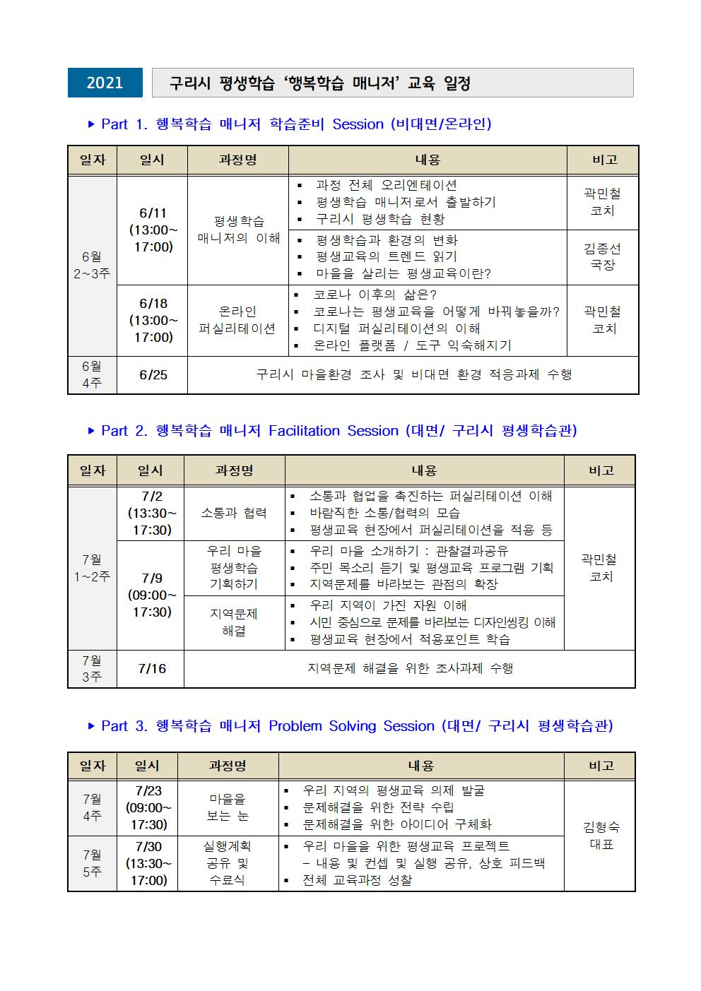 | 2021년 평생학습 마을활동가 ‘행복학습 매니저’ 참여자 및 교육일정 알림 | |