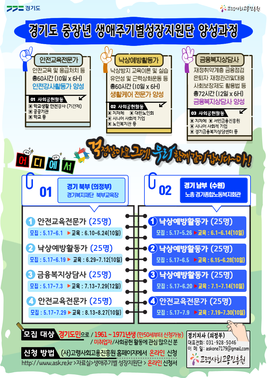 평생학습소식 이모저모 홈 평생학습마당 평생학습소식 이모저모 공유하기 네이버 페이스북 링크 프린트하기 평생학습소식 이모저모 상세보기 - 제목, 담당자, 작성일, 조회수, 파일, 내용 정보 제공 경기도 중장년 생애주기별성장지원단 모집 알림 작성자 : 김춘희 작성일 : 2021.06.14 19:38:27 조회 : 533 파일 png 문서 경기_중장년_생애주기별성장지원단_리플릿_.png 사진 확대보기 경기도 중장년 생애주기별 성장지원단 모집 알림 ○ 과 정 명 : 안전교육전문가, 낙상예방활동가, 금융복지상담사○ 사 업 량 : 200명○ 신청대상 : 1961~1971년생 미취업자○ 교육장소 : 북부(의정부), 남부(수원) ○ 내 용 : 중장년 양성교육 및 사회공헌활동 기회 제공○ 신청방법 : (사)고령사회고용진흥원 홈페이지 http://www.ask.re.kr/board/1565 ※ 교육비(무료), 사회공헌 활동 참여 시 참여수당 지급(1일 6시간이상 활동할 경우 월42만원) 목록 게시물삭제 본인삭제 게시물삭제 이전글 2021년 평생학습 마을활동가 ‘행복학습 매니저’ 참여자 및 교육일정 알림 다음글 「구리시 청소년성문화센터」 여름방학 특별 프로그램 운영 안내