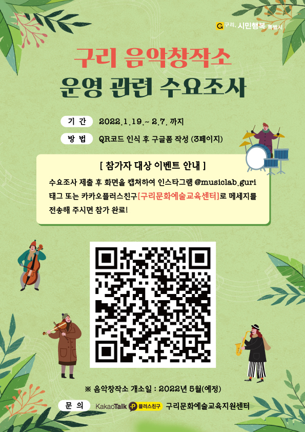 시민들의 의견을 수렴하여 구리 음악창작소(가칭)의 효율적인 운영 기반을 마련하고자 합니다. 이를 위해 아래와 같이 수요조사 홍보 및 참여 요청을 하오니 적극 협조하여 주시기 바랍니다 ■ 조사개요 ‧ 대 상 : 일반시민 및 음악 예술인 ‧ 기 간 : 2022.1.19~2.7(20일간) ‧ 방 법 : 온라인(수요조사 참여 및 음악창작소 SNS 팔로우 이벤트 진행) ‧ 링 크 : [일반시민 서식] https://url.kr/k2opn1 [음악예술인 또는 음악분야 종사자 서식] https://url.kr/uylx6f ‧ 문 의 : 카카오톡채널[구리문화예술교육지원센터] / 인스타그램 @musiclab_guri