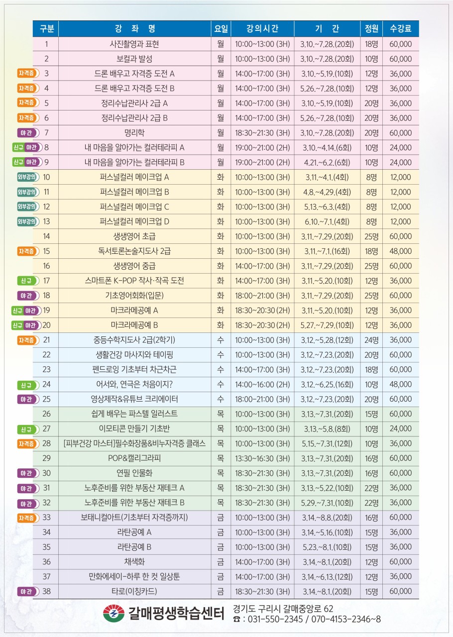 사진자료 홈 평생학습마당 사진자료 공유하기 네이버 페이스북 링크 프린트하기 사진자료 상세보기 - 제목, 담당자, 파일, 내용 정보 제공 [2025년 갈매평생학습센터 상반기 안내지] 작성자 : 유혜민 파일 jpg 문서 갈매_상반기_안내지 (1).jpg jpg 문서 갈매_상반기_안내지 (2).jpg 사진 확대보기 사진 확대보기 [2025년 갈매평생학습센터 상반기 안내지] 목록 게시물삭제 본인삭제 게시물삭제 이전글 [2025년 구리시 평생학습관 상반기 안내지] 다음글 [2025년 수택평생학습센터 상반기 안내지]
