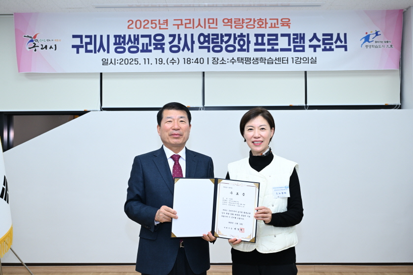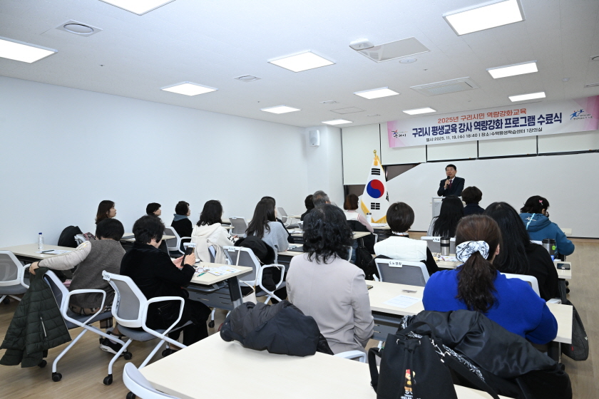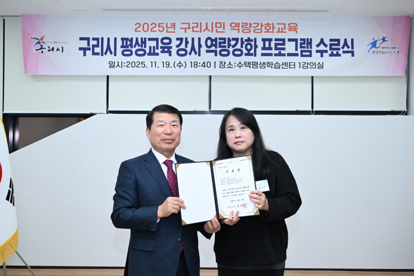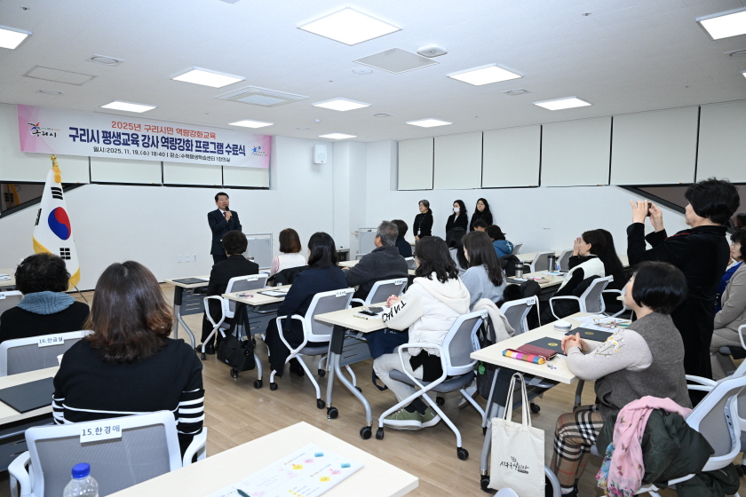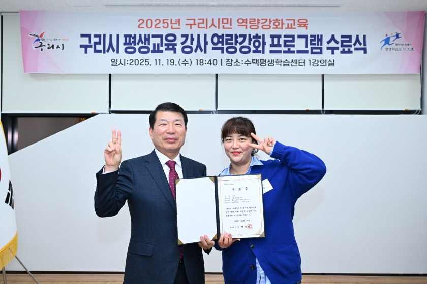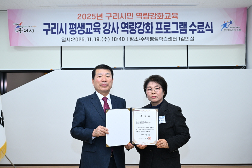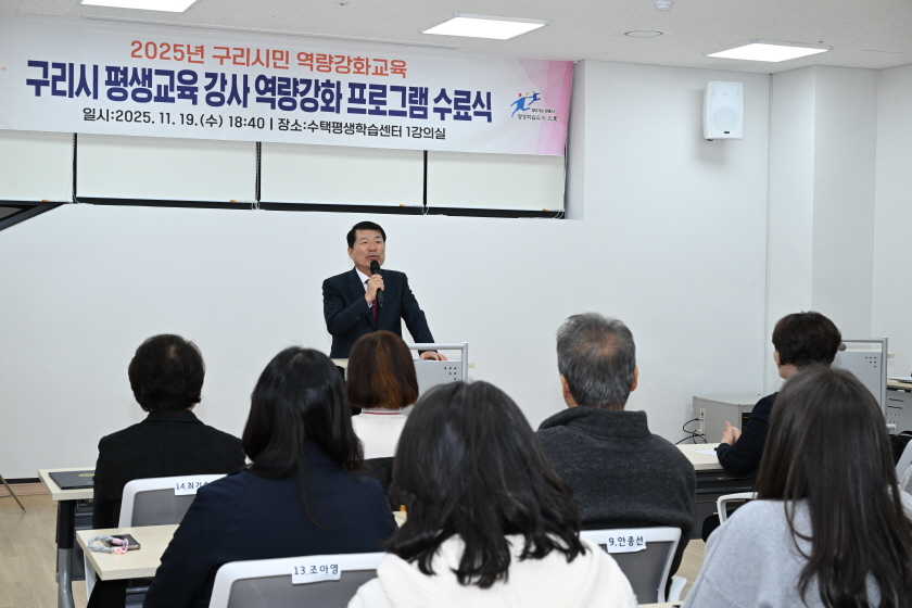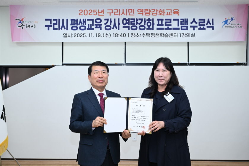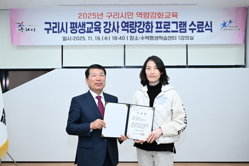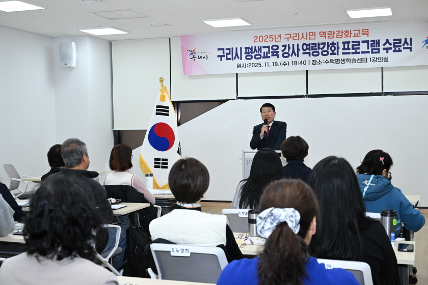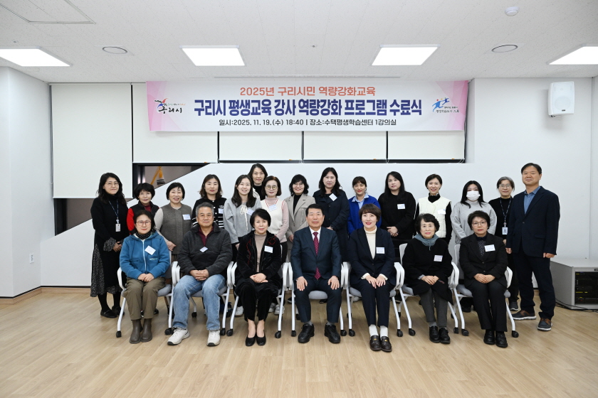구리시 평생교육 강사 역량강화 프로그램 수료식 구리시는 11월 19일 수택평생학습센터에서 '구리시 평생교육 강사 역량강화 프로그램 수료식'을 열었다. 이번 수료식은 평생교육 강사의 전문성과 역량 강화를 위해 마련됐다. 참석자들은 프로그램 수료를 기념하며 앞으로의 활동 계획을 공유했다. (수택평생학습센터 2025. 11. 19.) |