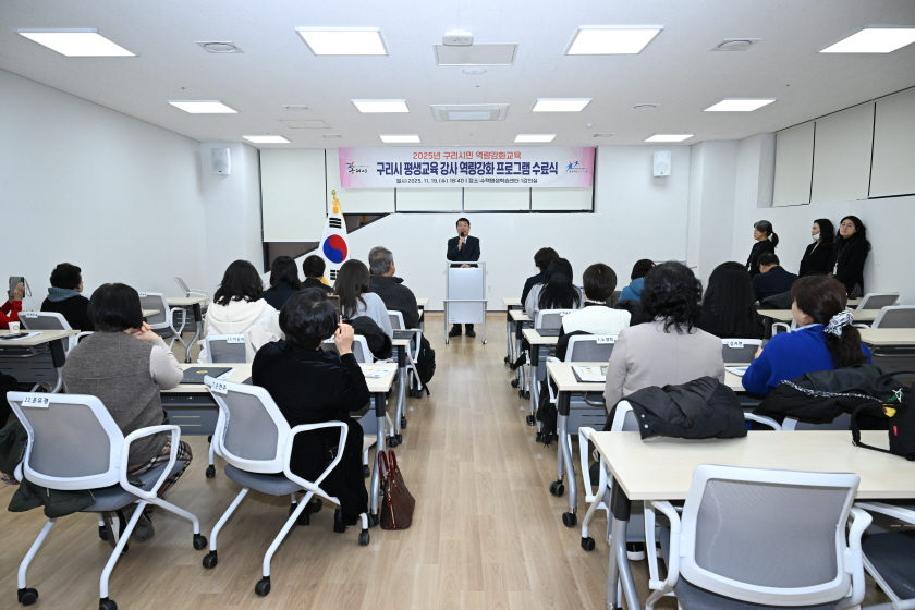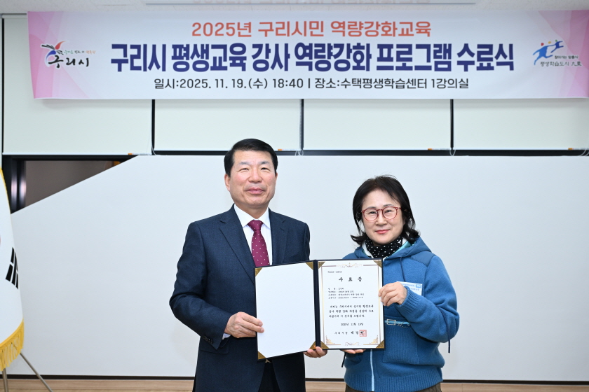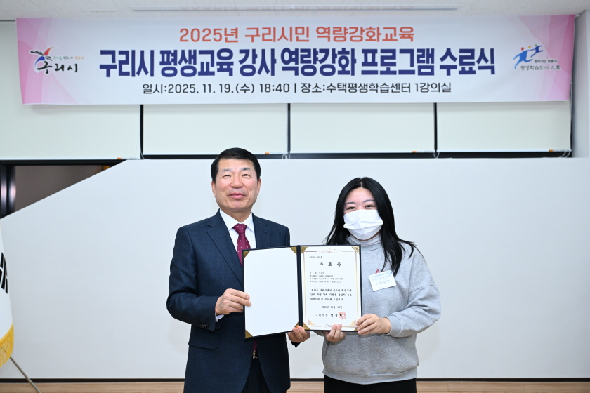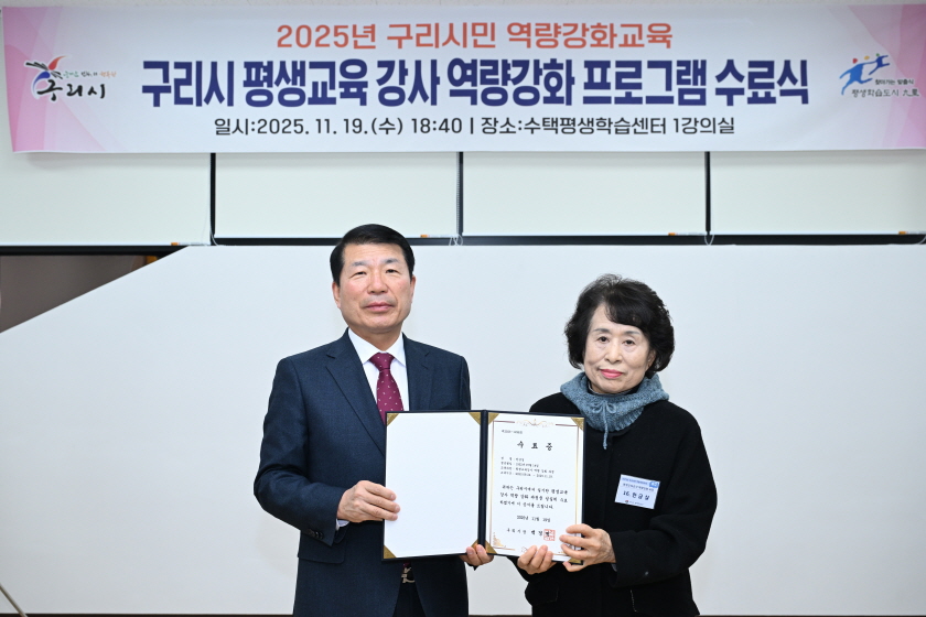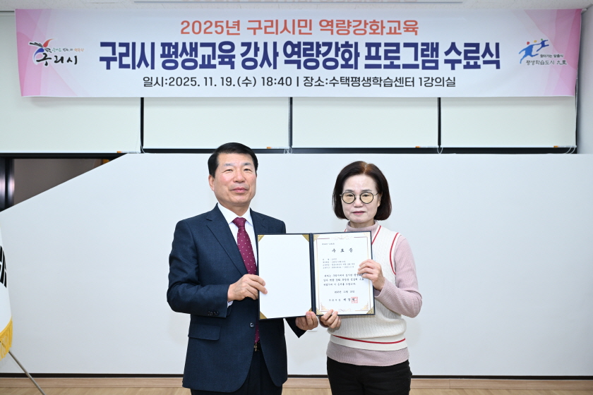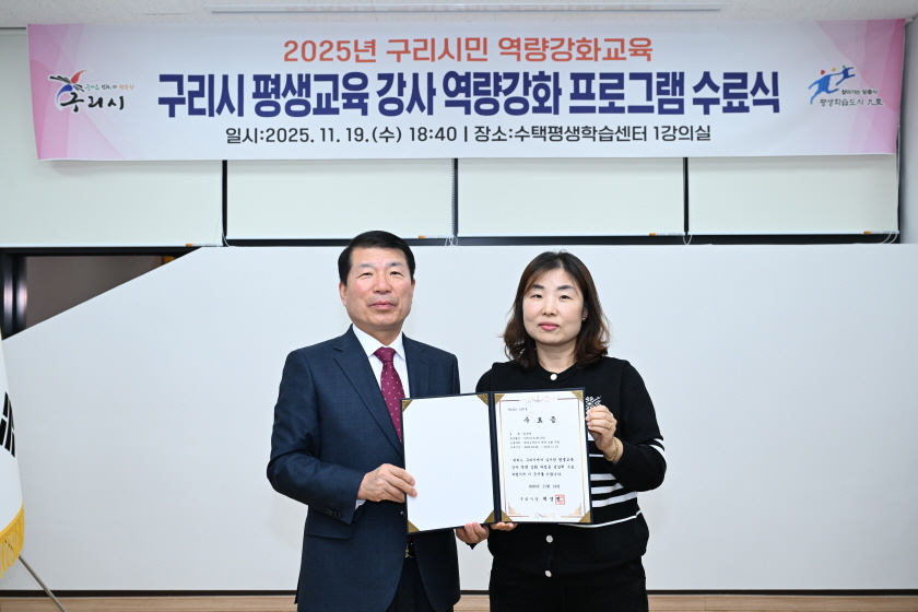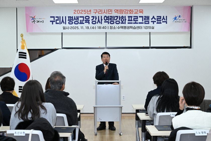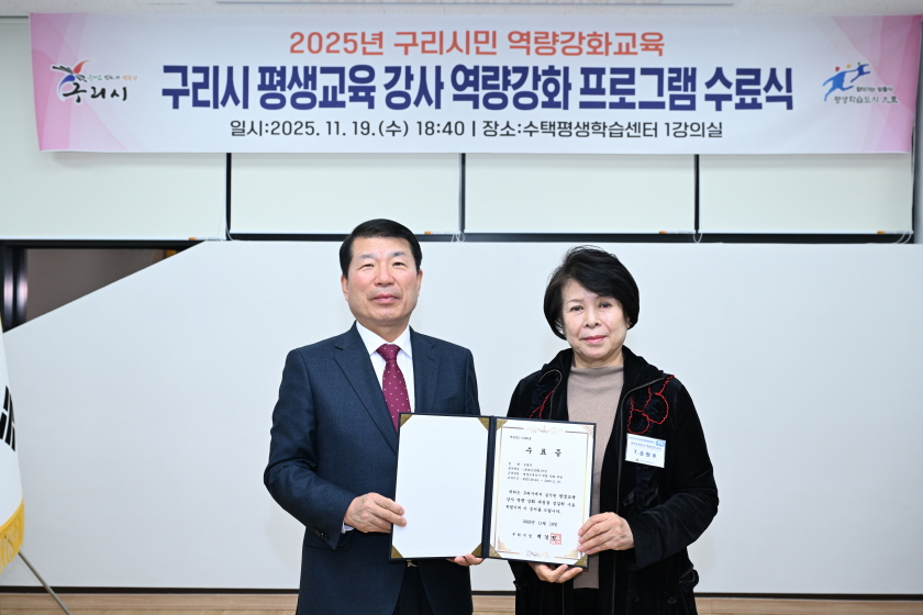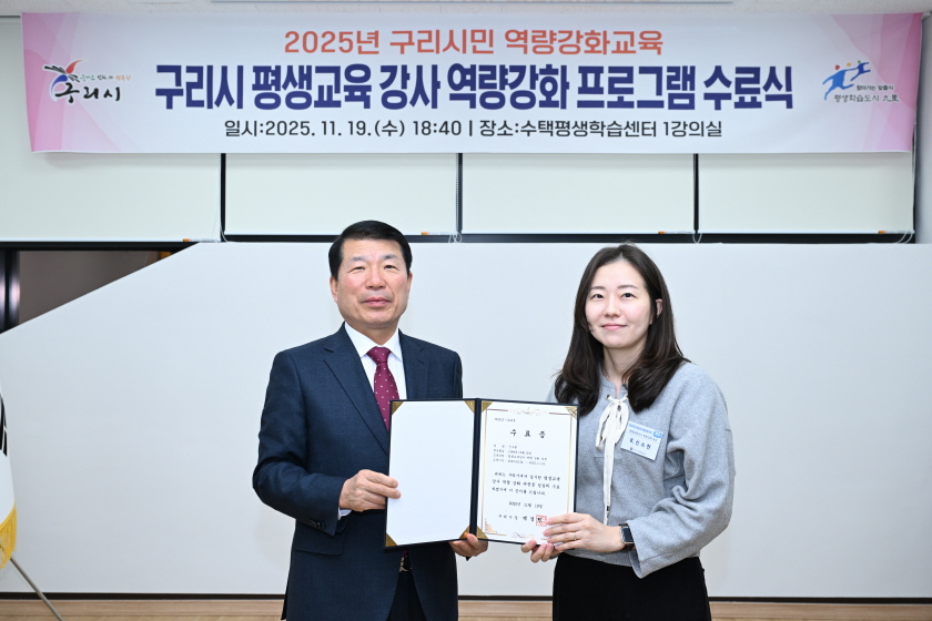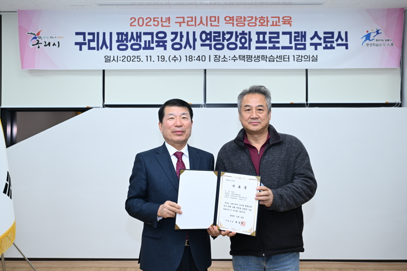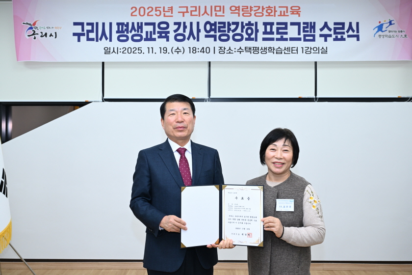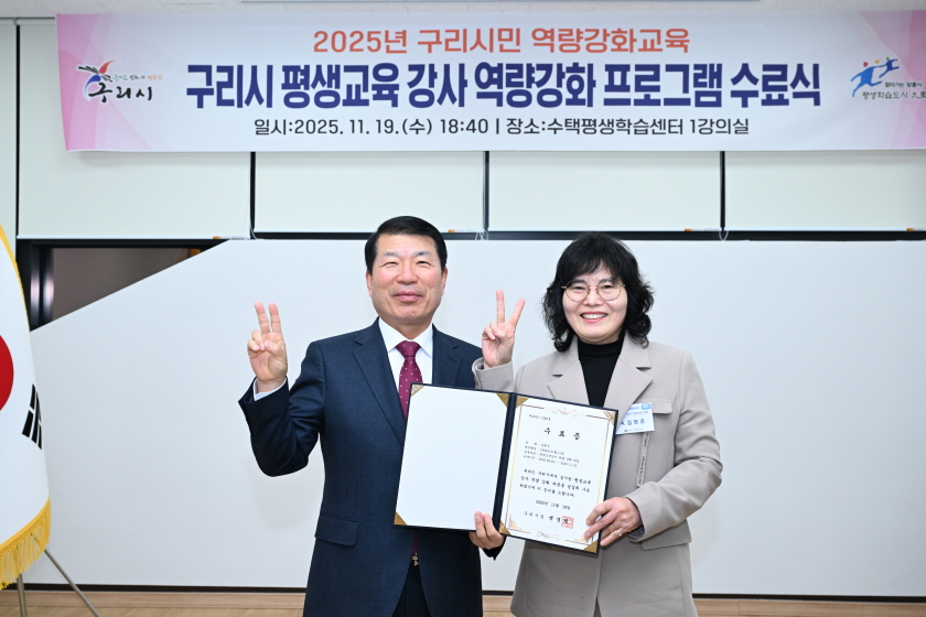 구리시 평생교육 강사 역량강화 프로그램 수료식 구리시는 11월 19일 수택평생학습센터에서 '구리시 평생교육 강사 역량강화 프로그램 수료식'을 열었다. 이번 수료식은 평생교육 강사의 전문성과 역량 강화를 위해 마련됐다. 참석자들은 프로그램 수료를 기념하며 앞으로의 활동 계획을 공유했다. (수택평생학습센터 2025. 11. 19.) |