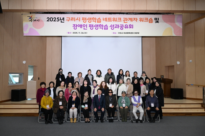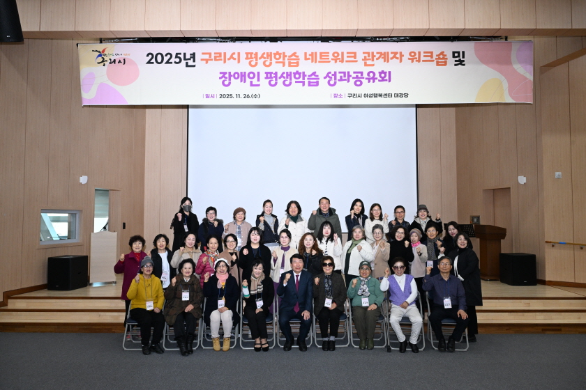 평생학습 관계자 워크숍 및 장애인 평생학습 성과공유회 구리시는 11월 26일 구리시여성행복센터 대강당에서 '평생학습 관계자 워크숍 및 장애인 평생학습 성과공유회'를 개최했다. 이번 행사는 평생학습 관계자들이 서로의 경험과 노하우를 공유하고, 장애인 평생학습 프로그램의 성과를 발표하며 앞으로의 발전 방향을 모색하는 자리로 마련됐다. (구리시여성행복센터 대강당 2025. 11. 26.) |