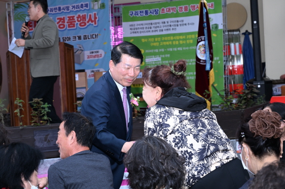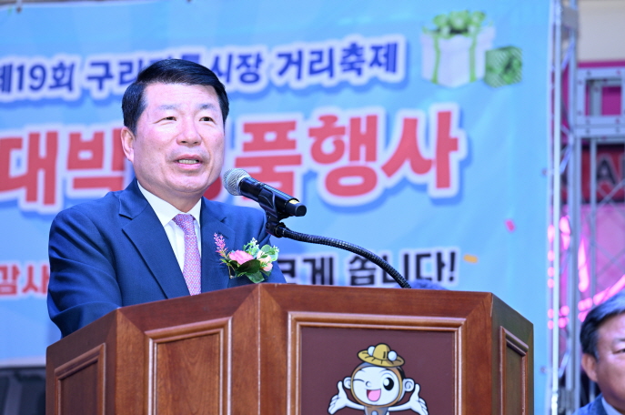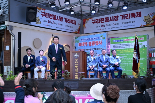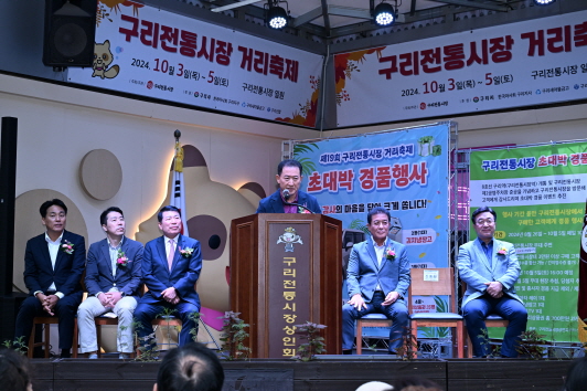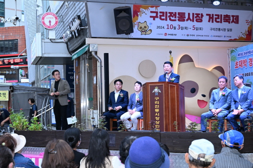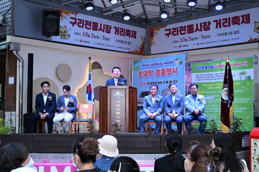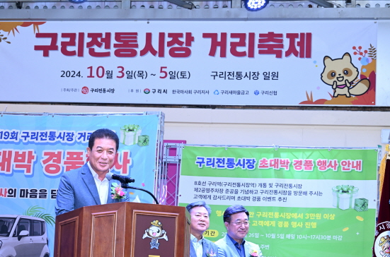제19회 구리전통시장 거리축제 개막식 구리전통시장상인회가 10월 3일 구리전통시장에서 주최한 ‘제19회 구리전통시장 거리축제 개막식’에 참석한 백경현 구리시장은 축사를 했다. ‘제19회 구리전통시장 거리축제’는 10월 3일 개막식을 시작으로 10월 5일까지 ‘문화와 예술이 있는 구리전통시장’을 주제로 구리전통시장만의 오랜 전통을 자랑하는 행사다. (구리전통시장 2024. 10. 3.) |