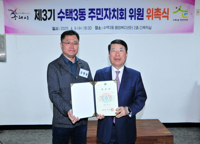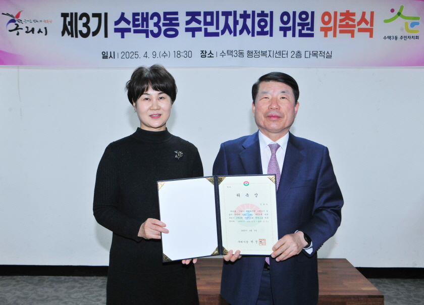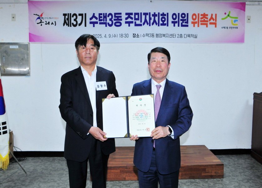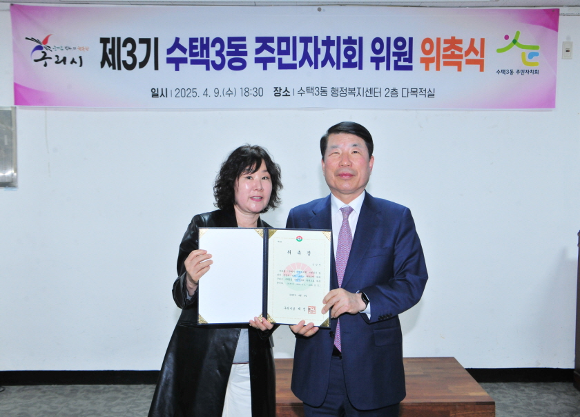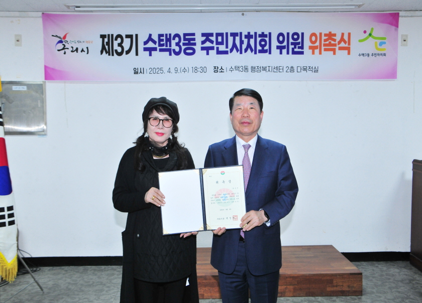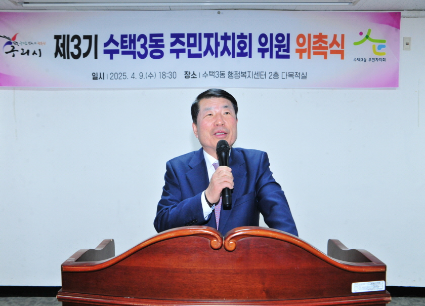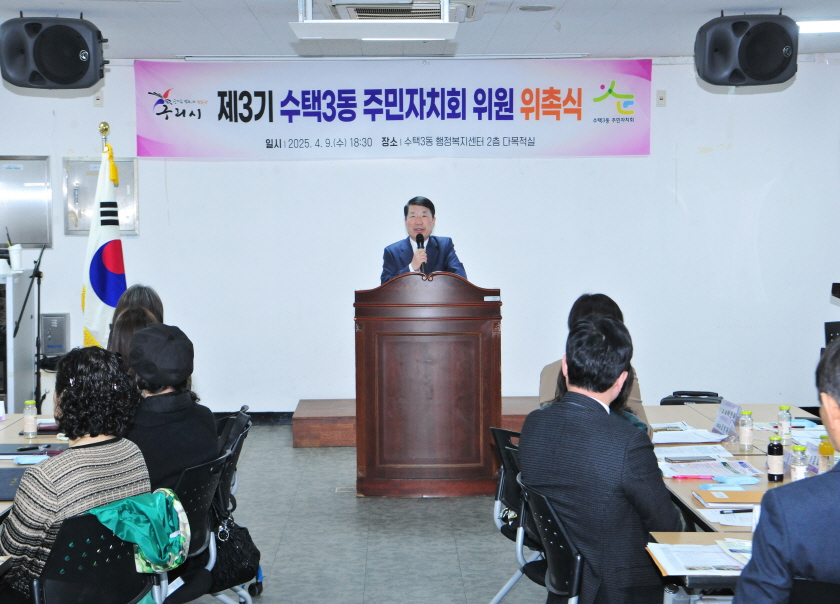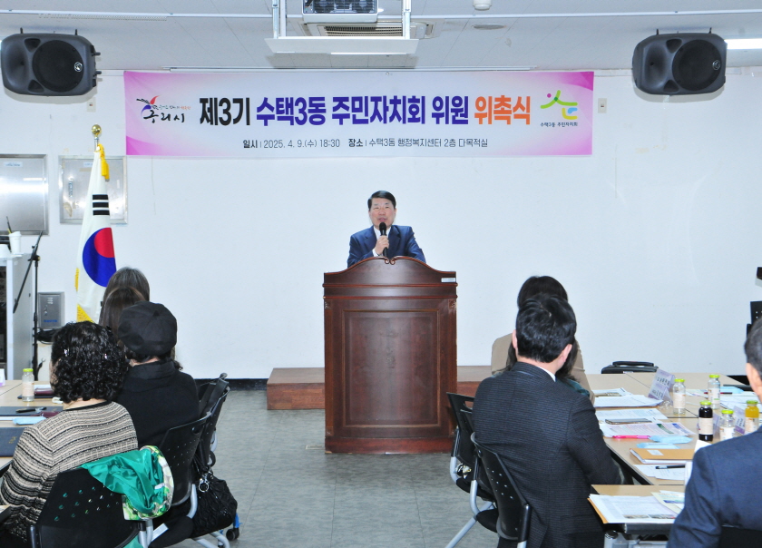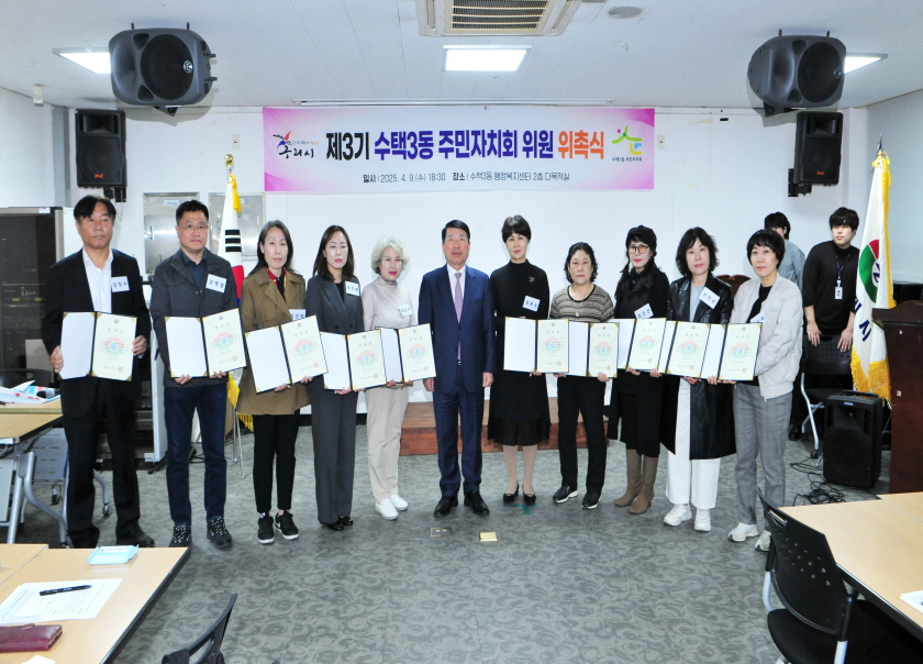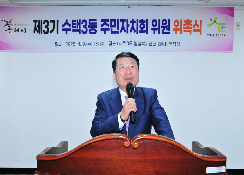제3기 수택3동 주민자치회 위원 위촉식 수택3동 주민자치회는 4월 9일 수택3동행정복지센터 2층 다목적실에서 ‘제3기 수택3동 주민자치회 위원 위촉식’을 개최했다. 행사에 참석한 백경현 구리시장은 신규 주민자치회 위원들에게 위촉장을 수여하고 인사말을 했다. (수택3동행정복지센터 2층 다목적실 2025. 4. 9.) |