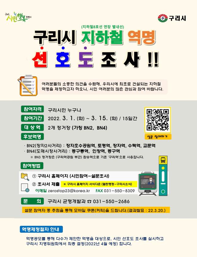구리시, 지하철 8호선 연장 별내선 역명 선호도 조사 실시 지역 대표성 보유, 이해하고 부르기 쉬운 역명으로 제정 추진 □ 구리시(시장 안승남)가 1일부터 15일까지 지하철 8호선 연장 별내선 구리시 구간의 역명 제정을 위해 공모한 역명 대상 선호도 조사 실시 □ 지하철 8호선을 연장한 별내선 복선전철은 2023년 준공을 목표로 건설 중 〇 구리시는 시민의 의견을 수렴하여 구리시 구간에 건설 중인 3개의 정거장(BN2, BN3, BN4)의 역명 제정을 추진 □ 참여 방법은 구리시청 홈페이지(시민참여-설문조사) 참여, 이메일(zerostop23@korea.kr), 팩스(031-550-8309), 방문 접수도 가능 〇 주민의 참여를 장려하기 위해 참여자 중 추첨을 통해 소정의 상품(모바일 커피쿠폰, 50명)을 지급할 예정 |