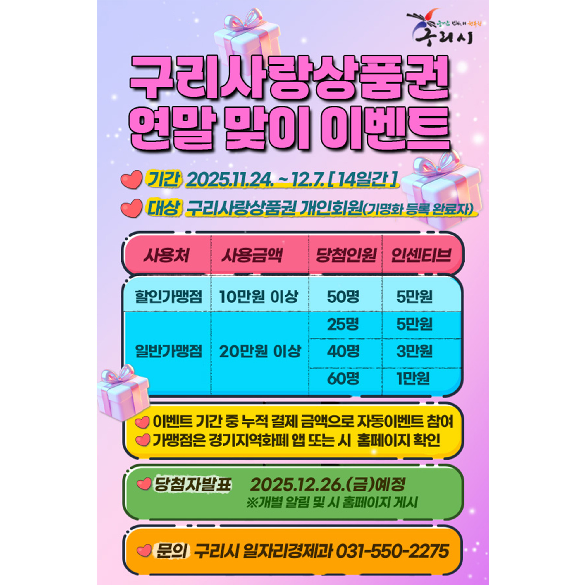카드뉴스 홈 구리소식 카드뉴스 공유하기 네이버 페이스북 링크 프린트하기 구리소식 > 카드뉴스 qr코드 열기 모바일로 QR코드를 스캔하면 이 페이지로 바로 접속 할 수있습니다. 구리사랑카드 연말 맞이 이벤트 문의전화 작성일 2025.11.27 조회수 26 1번 이미지 보기 구리사랑카드 연말 맞이 이벤트 구리사랑상품권 연말 맞이 이벤트.jpg 다운로드 목록 이전글 2025 와구리 김장축제 다음글 2025 크리스마스트리 점등식