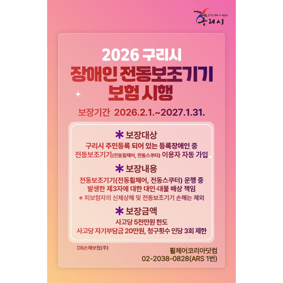 카드뉴스 홈 구리소식 카드뉴스 공유하기 네이버 페이스북 링크 프린트하기 구리소식 > 카드뉴스 qr코드 열기 모바일로 QR코드를 스캔하면 이 페이지로 바로 접속 할 수있습니다. 장애인 전동보조기기 보험 시행 문의전화 작성일 2026.02.20 조회수 4 1번 이미지 보기 장애인 전동보조기기 보험 시행 2월 19일 01_정사각.jpg 다운로드 목록 이전글 2026 설 연휴 쓰레기 배출 안내 다음글 2026 구리시 교통약자 이동지원 서비스 안내