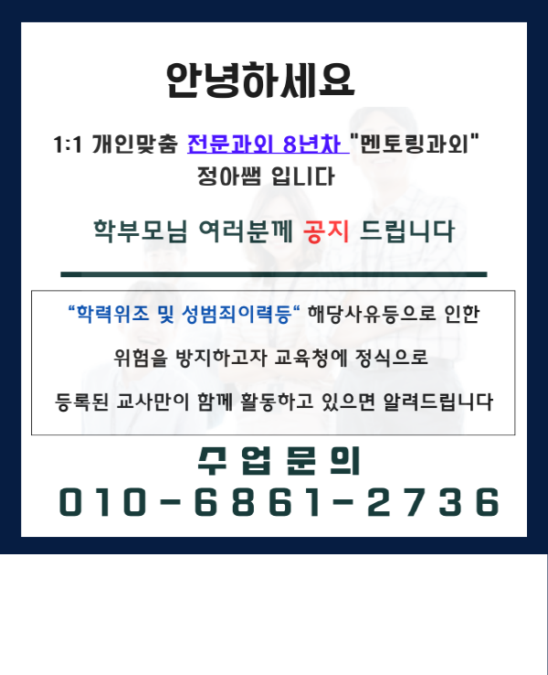 안녕하세요^^ 8년 전문 과외 원장 입니다 ^^ 학년별 / 과목별 전문 교사의 퀄리티 있는 수업으로 학생 개개인에게 맞춤 수업으로 진도 나가고 있습니다.