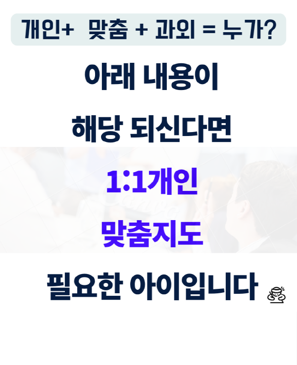 - 학원 수업을 못따라가는 학생 - 낯을 많이 가려서, 질문을 잘 못하는 학생 - 자기주도적인 학업 습관이 잡혀져 있지 않은 학생 - 열심히 하는데 성적이 안오르는 학생