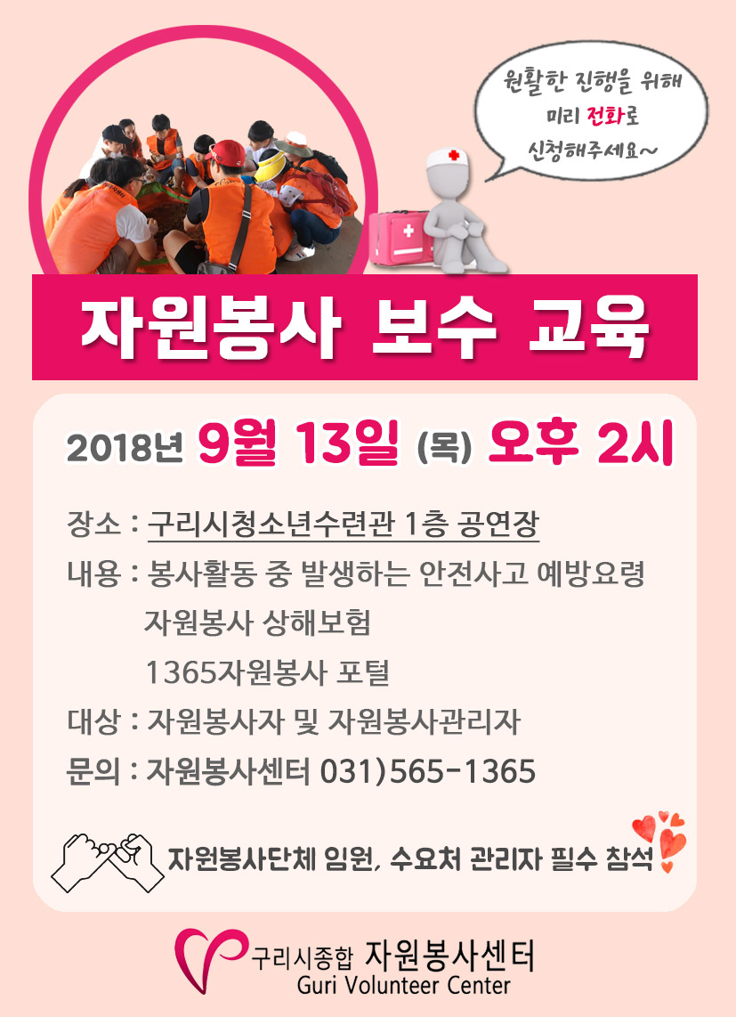 자원봉사 보수 교육 2018년 9월 13일 (목) 오후 2시 장소 : 구리시청소년수련관 1층 공연장 내용 : 봉사활동 중 발생하는 안전사고 예방요령 대상 : 자원봉사자 및 자원봉사관리자 문의 : 자원봉사센터 031)565-1365 자원봉사단체 임원, 수요처 관리자 필수 참석 구리시종합 자원봉사센터 Guri volunteer Center |