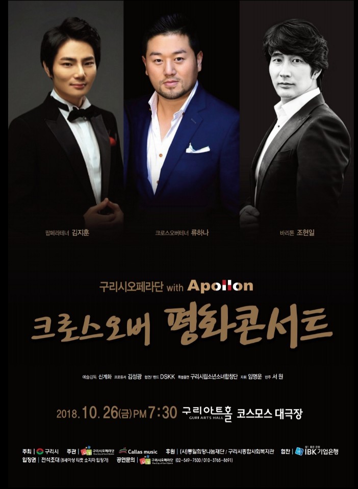 구리시오페라단에서 평화를 염원하며 아름다운 대한민국을 희망하는 마음을 모아 대중에게 친숙한 주옥같은 음악들을 선곡해 공연의 깊은 울림과 감동으로 희망과 위로를 전하며 새터민가족 과 자원봉사자들을 초정하혀 아름다운 세상을 함께 나누는 "크로스오버 평화콘서트"를 개최하오니 깊어가는 가을 소중한 추억을 만드시길 바랍니다. 0 일시 : 2018. 10. 26.(금) 19:30 0 장소 : 구리아트홀 코스모스대극장 0 입장료 : 전석무료(사전예약제) 문의전화 010-3765-8691, 031-550-2066 |