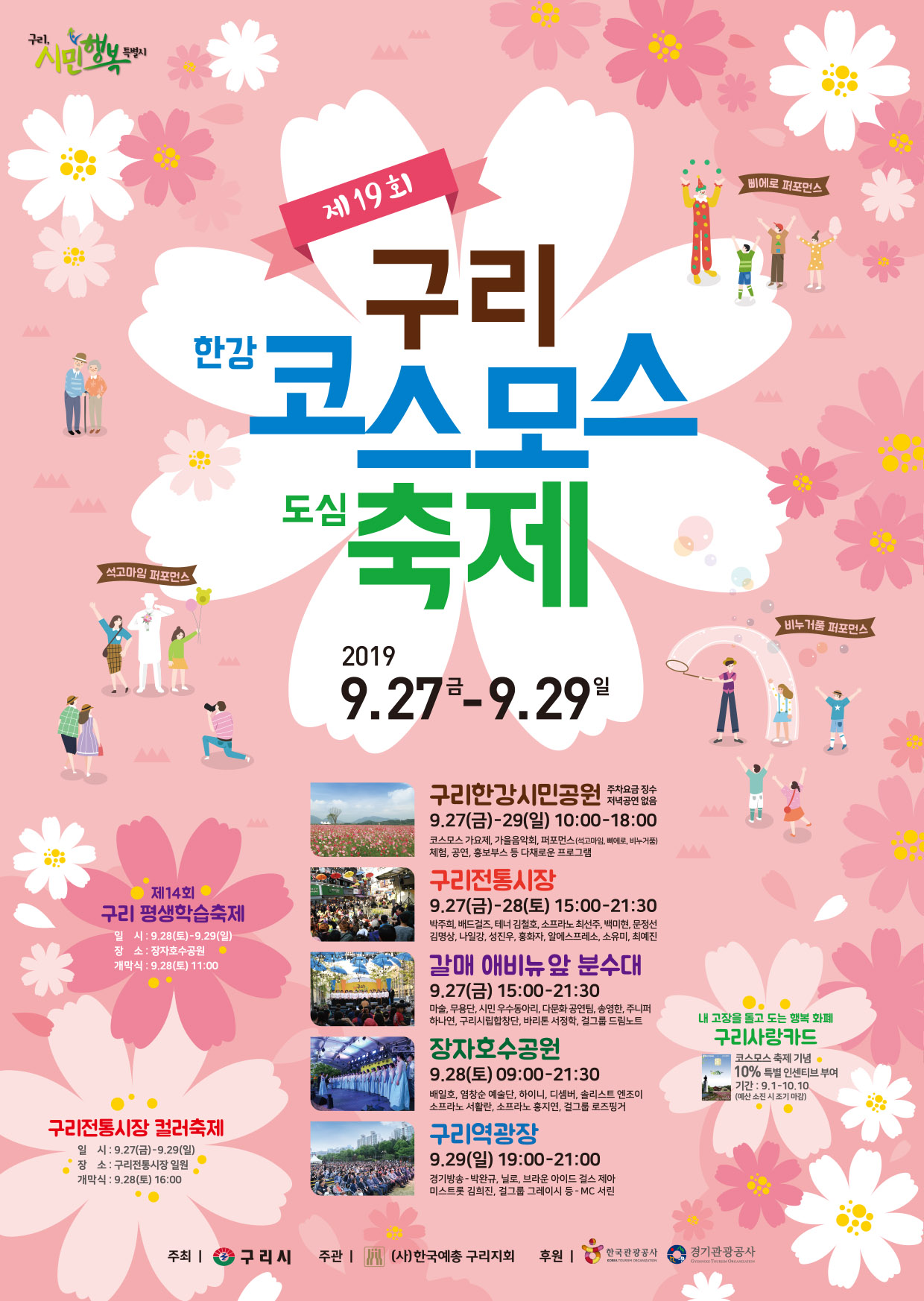 문화행사 홈 구리소식 문화행사 공유하기 네이버 페이스북 링크 프린트하기 구리소식 > 문화행사 qr코드 열기 모바일로 QR코드를 스캔하면 이 페이지로 바로 접속 할 수있습니다. 문화행사 상세보기 - 제목, 담당자, 연락처, 행사일, 작성일, 조회수, 파일, 내용 정보 제공 제19회 구리 코스모스 축제 (9.27~9.29) 작성자 : 양덕윤 작성일 : 2019.09.04 13:48:43 조회 : 1,699 연락처 행사일 20190927 파일 jpg 문서 사본 -코스모스축제_포스터(경기도 제외).jpg 사진 확대보기 목록 게시물삭제 본인삭제 게시물삭제 이전글 인창도서관 인문학강좌 "신영복이라는 장르읽기" 수강자 모집 다음글 구리9경 스토리텔링북 시민작가 모집