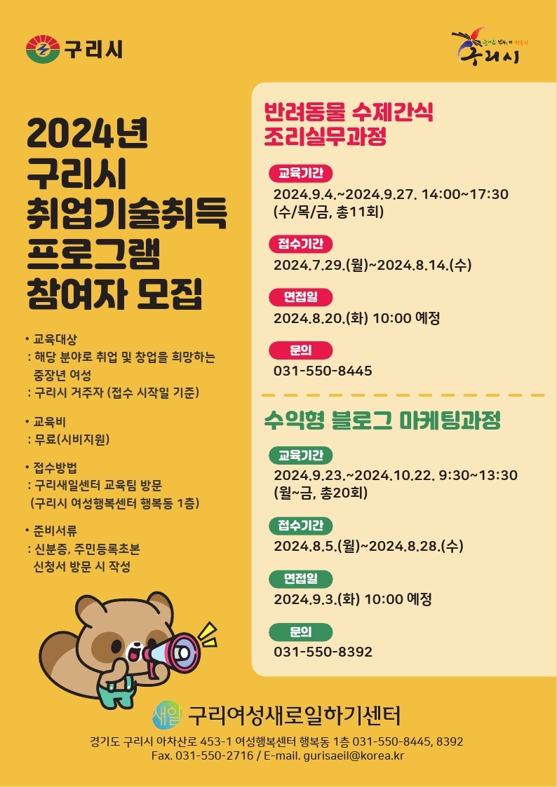 24년 구리새일센터 취업기술취득 프로그램 '수익형 블로그 마케팅 과정' 무료 교육생 모집 (시비지원) ■ 교육개요 ▸교육기간 : 2024. 9. 23. ~ 10. 22. 9:30~13:30 (월~금) ▸교육대상 : 교육 수료 후 해당분야로 취업 및 창업 의지가 분명한 여성 20명 ▸교 육 비 : 무료 (시비지원) ■ 모집요강 ▸접수기간 : 24.8.5.(월)~8.28.(수) ▸서류합격발표(예정)일 : 24. 8.30.(금) ▸면접(예정)일 : 24.9.3.(화) ※서류합격자에 한하여 확정일정 개별안내 ▸준비서류 : 신분증, 주민등록초본 (8월5일 이후 구리시 거주자 확인용) ▸그외 참가신청서류 : 방문 작성 ■ 선발방법 : 1차 서류접수 -> 면접전형 -> 최종선발(20명) ■ 접수방법 : 구리시 여성행복센터 행복동 1층 구리새일센터 방문접수 (근무시간 내 - 오전9시~ 오후6시) ■ 문의 : 031-550-8392 * 더 자세한 내용은 첨부파일 (안내문) 참고 바랍니다. |
