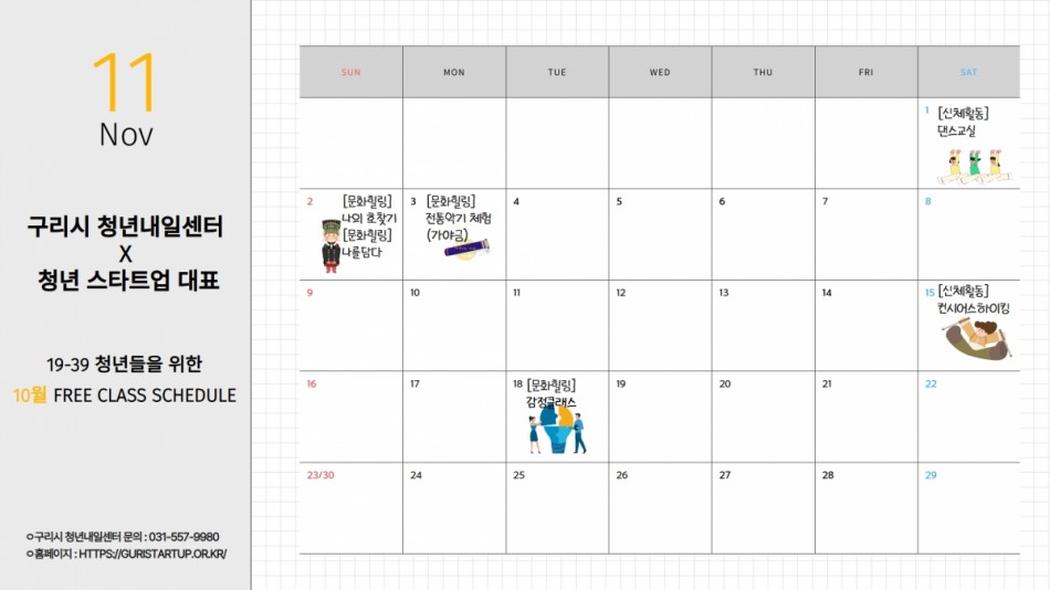 ⌜구리시청년내일센터 x 청년 스타트업 대표⌟ 19-39청년들을 위한 11월 FREE CLASS SCHEDULE